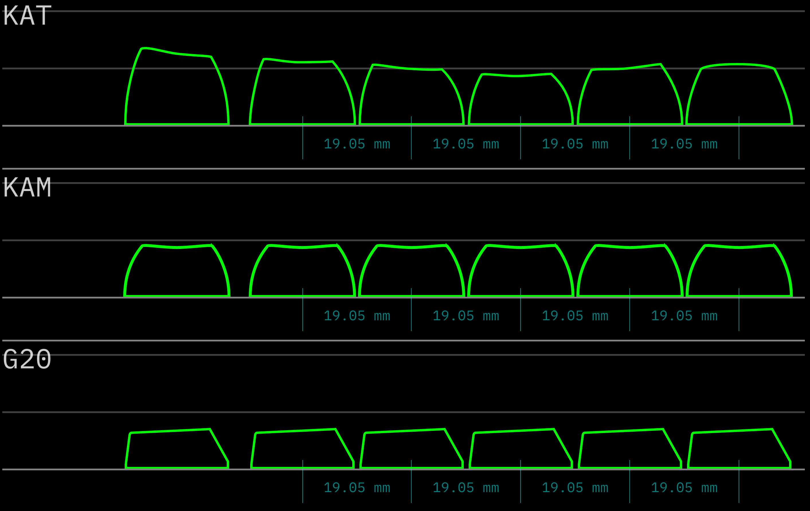 - KAM: Essentially a uniform version of the KAT keycap profile, so that all rows are the same shape and height.